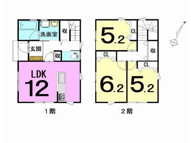 | 詳細間取 | 3LDK (2階:洋6.2帖×1、2階:洋5.2帖×1、2階:洋5.2帖×1、1階:LDK12帖) | ||