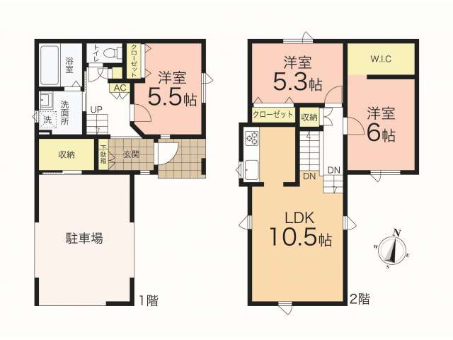 | 詳細間取 | 3LDK (1階:洋5.5帖×1、2階:洋6帖×1、2階:洋5.3帖×1、2階:LDK13.5帖) | ||